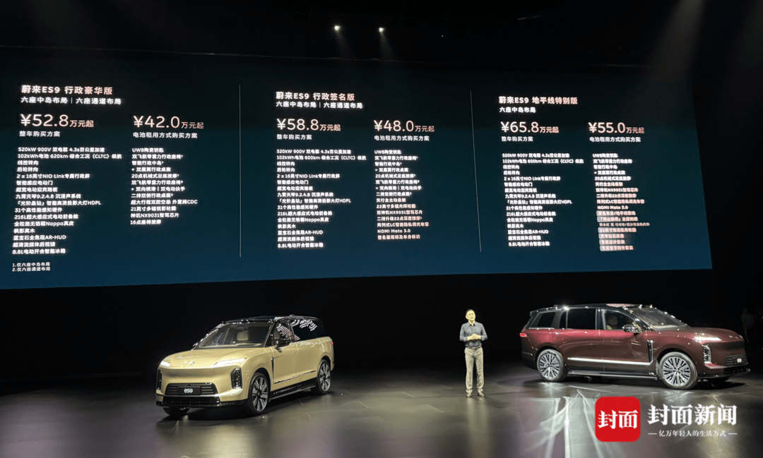 作为蔚来首款全尺寸纯电SUV,ES9以5365mm车长和3250mm轴距直指高端市场,搭载天行智能底盘、全域900V高压架构、三颗激光雷达及自研5nm智驾芯片,CLTC续航最高达620km。其核心策略并非单一参数竞争,而是依托蔚来换电网络、服务体系与全栈自研能力构建体系化优势,试图在增程与插混主导的旗舰市场中开辟纯电赛道。整车购买方案起售价52.8万元,BaaS租电方案则降至42.0万元,形成差异化价格策略。