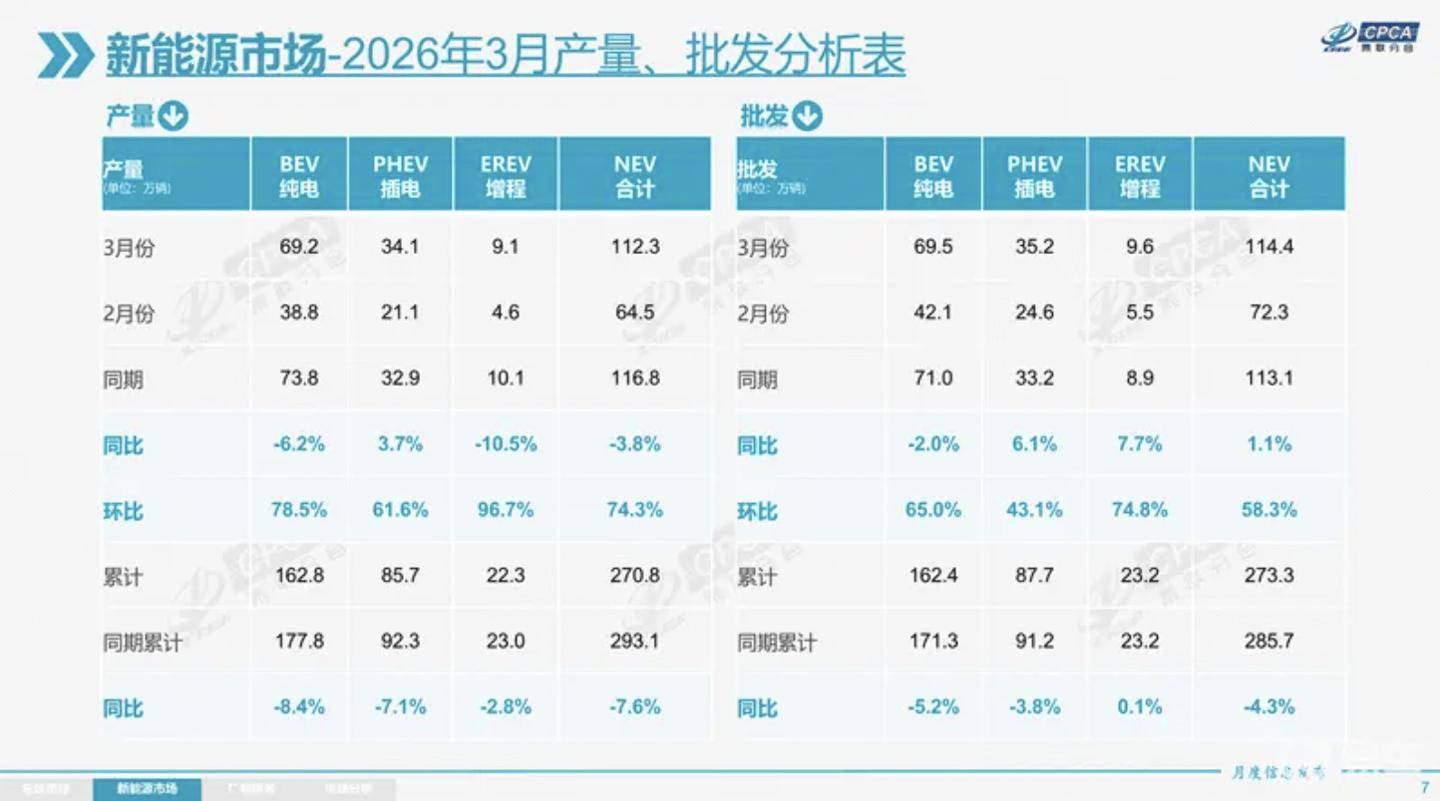 豪华车市场呈现企稳迹象,3月零售21万辆环比增长62%,市场份额提升至12.9%。随着产品定价策略调整,传统豪华品牌展现出较强韧性。新能源乘用车领域则呈现"冰火两重天":生产端112.3万辆的产量同比下降3.8%,但批发销量达114.4万辆实现1.1%的同比增长。零售市场84.8万辆的销量虽同比下降14.4%,但环比激增82.6%,显示出需求端的强劲复苏势头。