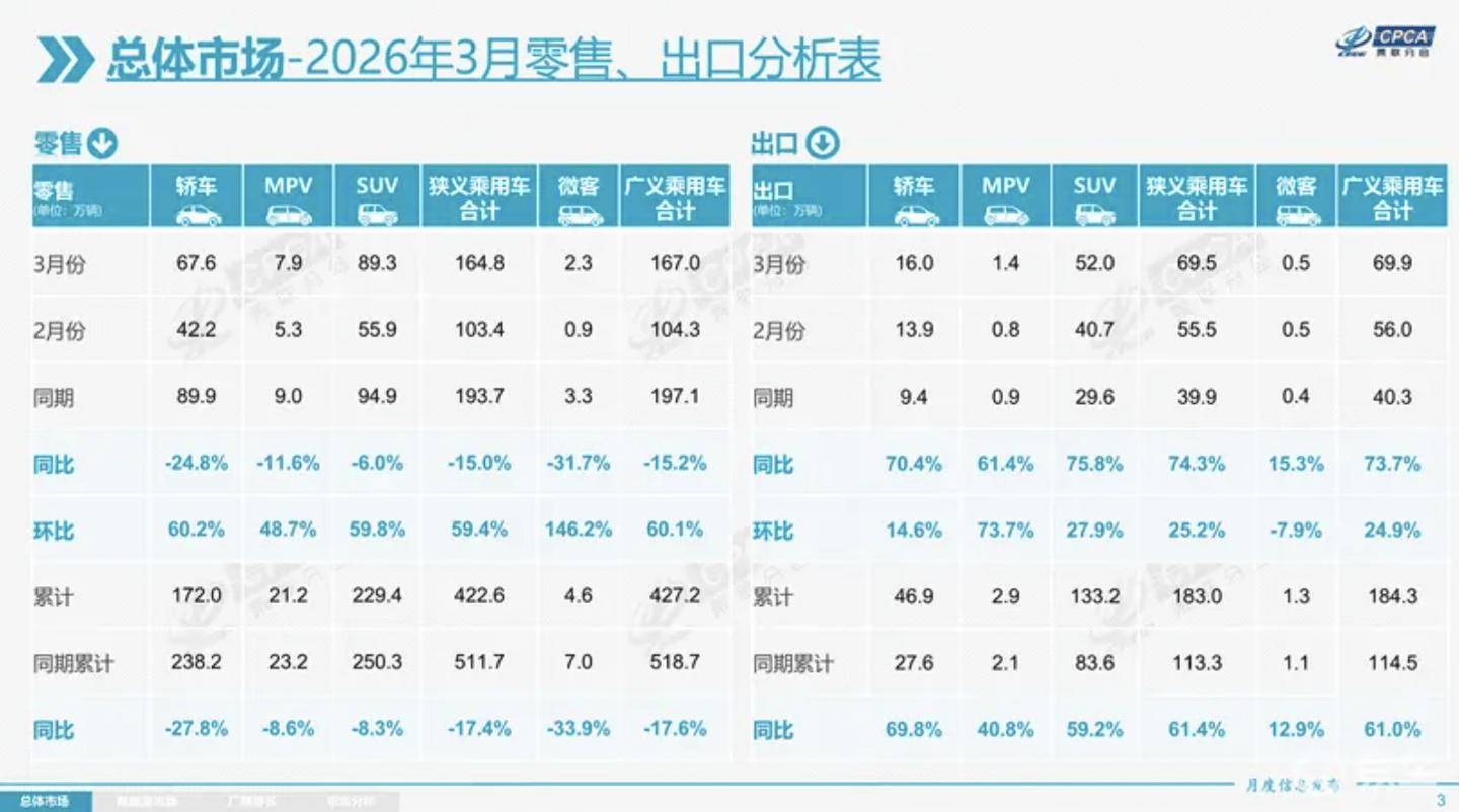 根据乘联会最新发布的数据,2026年3月全国乘用车市场呈现出复杂态势。当月全国乘用车零售总量达164.8万辆,尽管环比出现59.4%的显著增长,但同比仍下降15.0%。今年前三个月累计零售量422.6万辆,同比降幅达17.4%,反映出市场整体承压态势。