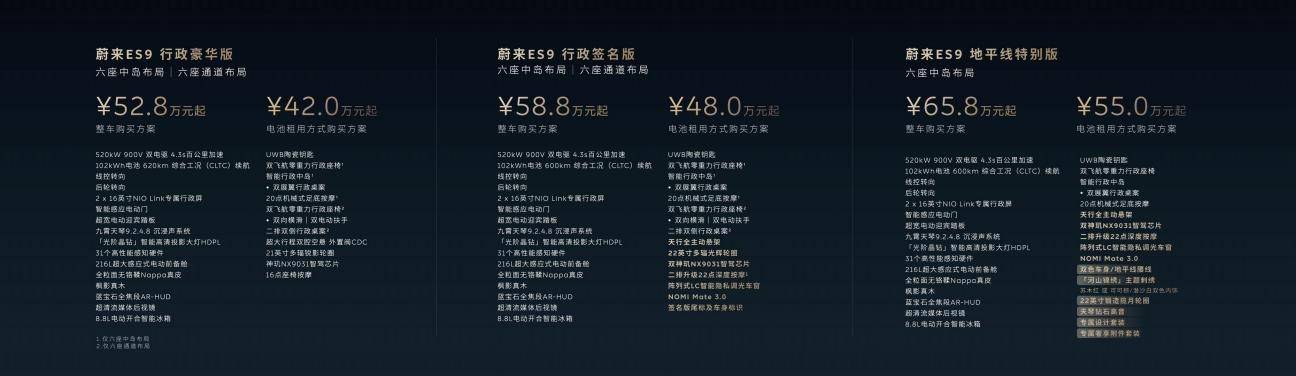预售方案提供行政豪华版、行政签名版、地平线特别版三个版本,起售价分别为52.8万元、58.8万元和65.8万元。选择BaaS电池租用方案的用户可享受10.8万元至10.8万元不等的价格优惠,最低预售价下探至42万元。即日起至正式上市前,预订用户支付5000元定金可抵扣1万元购车款,蔚来ES8创始版首任车主额外获得1万元焕新礼金券,非创始版ES8车主及乐道、萤火虫品牌首任车主分别可享6000元礼金券和2万复购积分。