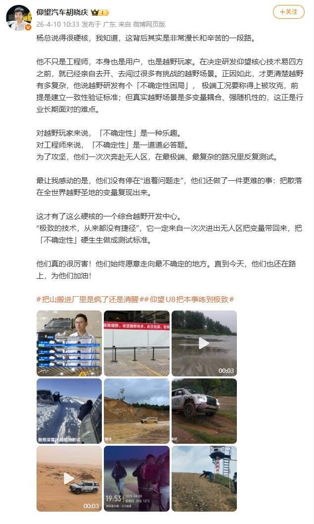 比亚迪仰望销售事业部总经理胡晓庆近日在社交平台分享了仰望系列越野车型研发背后的故事,引发行业关注。她透露,比亚迪高级副总裁杨冬生不仅是技术专家,更是一位资深越野玩家,在决定启动"易四方"核心技术研发前,曾亲自驾驶车辆挑战多种复杂地形,积累了大量实战经验。这种从用户视角出发的技术探索,为后续研发奠定了重要基础。