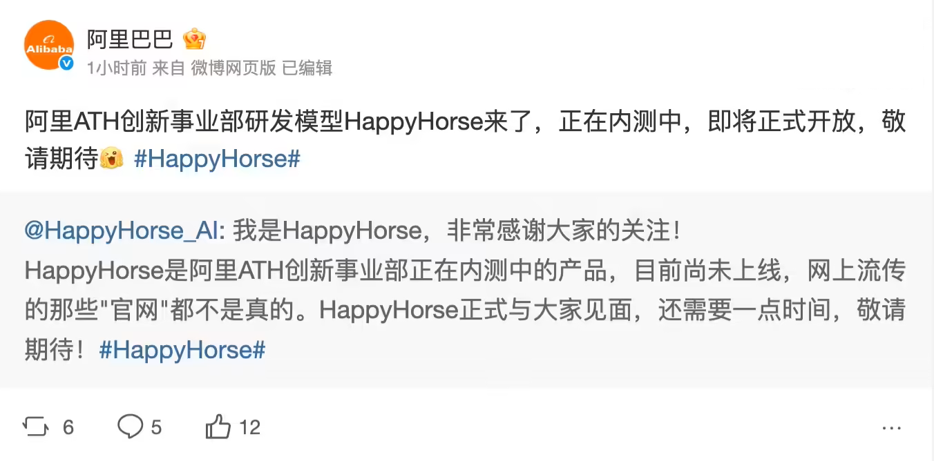 随着热度不断攀升,北京时间今日午间,HappyHorse 正式开通官方微博“@HappyHorse_AI”,并发布首条内容。微博中,HappyHorse 团队向广大用户表达感谢,同时澄清目前该产品仍处于阿里 ATH 创新事业部的内测阶段,尚未正式上线,网上流传的所谓“官网”均为虚假信息,并表示正式与大家见面还需一些时间,希望大家耐心等待。