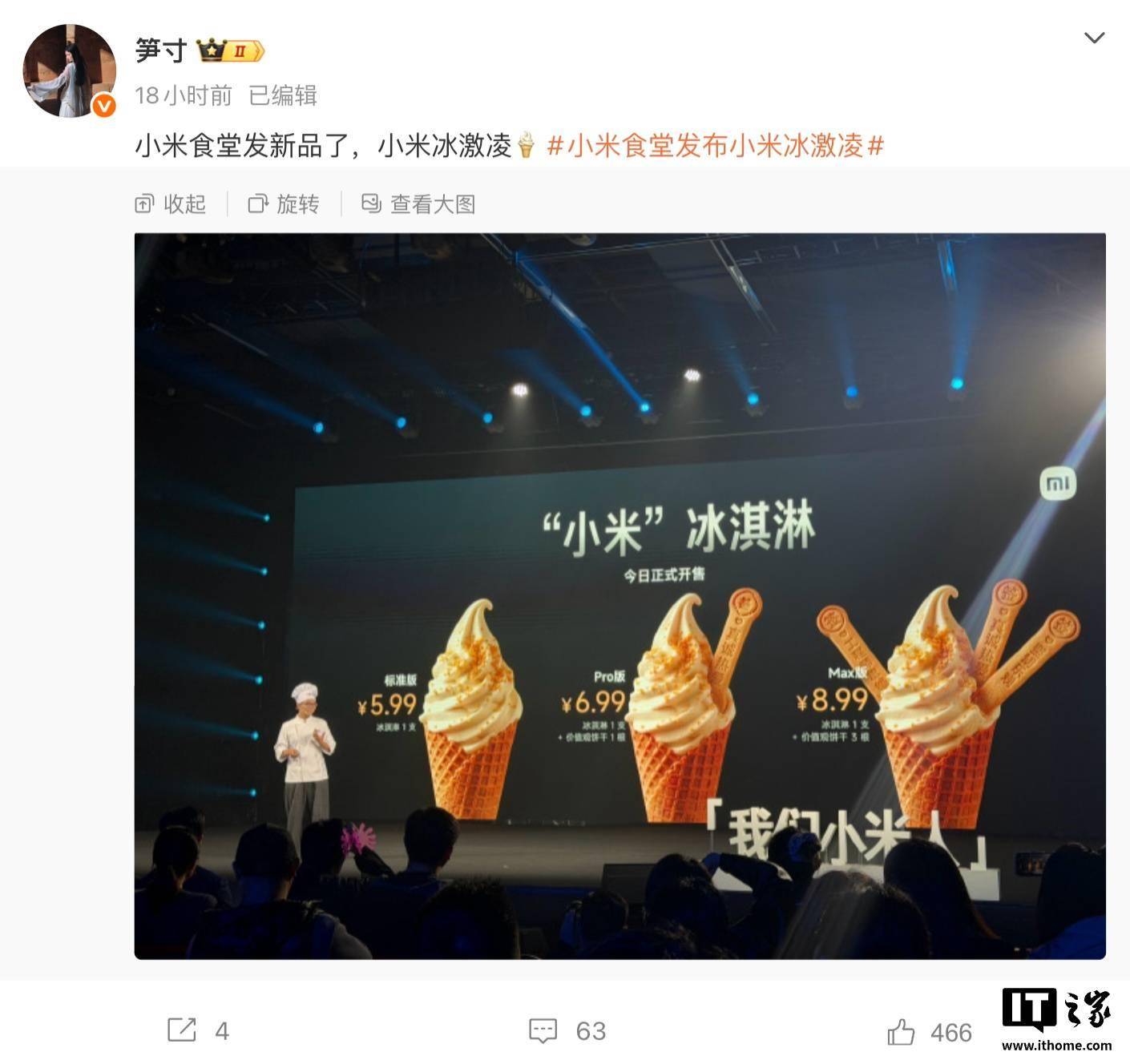据悉,小米冰淇淋共推出标准版、Pro版和Max版三种规格,价格分别为5.99元、6.99元和8.99元。不过,这款新品目前仅面向小米公司内部员工销售,并未对外公开售卖。小米REDMI产品经理“笋寸”在社交媒体上分享了大会现场照片,并透露冰淇淋在短时间内就被抢购一空。