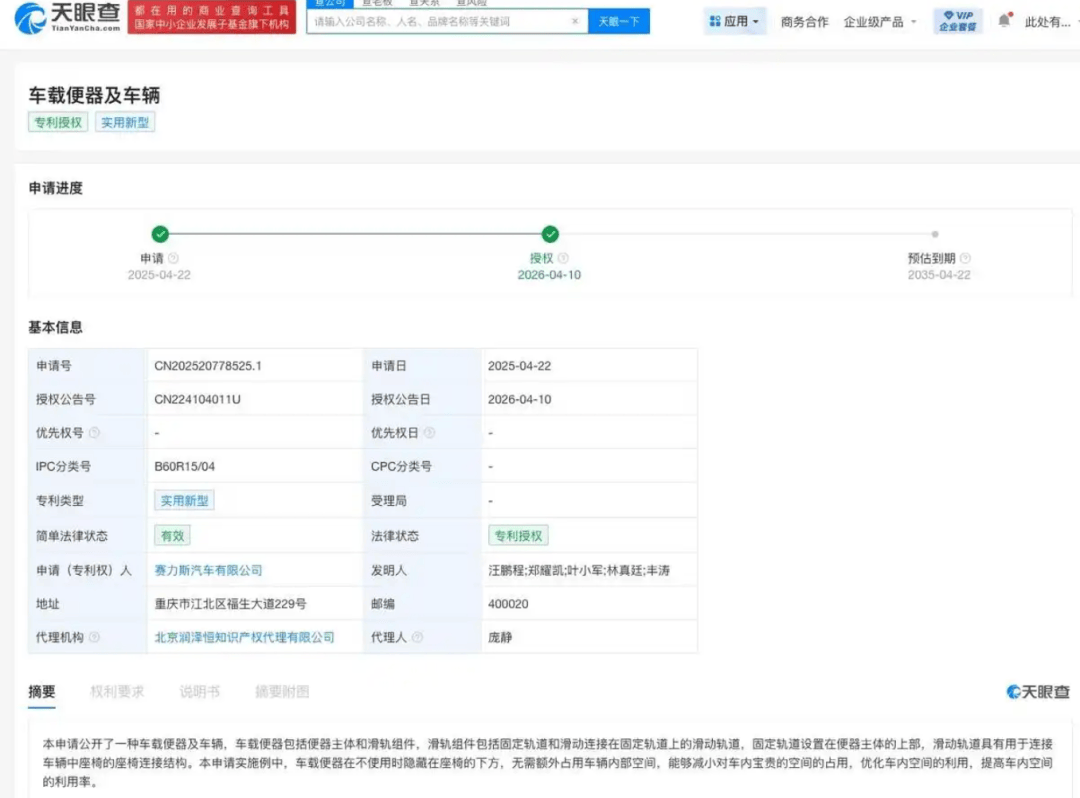 当新能源汽车的竞争从续航、智能驾驶延伸到生活场景,赛力斯再次以“脑洞大开”的创新引发行业关注。近日,国家知识产权局公布的一项专利显示,赛力斯申请的“车载便器”技术已获授权,这项被业内称为“汽车厕所”的装置,或将重新定义移动空间的便利性边界。