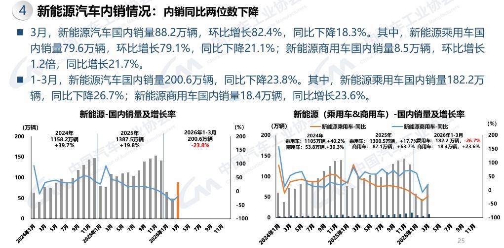 新能源商用车市场也持续升温。2026年3月,国内新能源商用车销量8.5万辆,环比增长1.2倍,同比增长21.7%,占商用车国内销量的比例为23.6%。1 - 3月,新能源商用车国内销量累计18.4万辆,同比增长23.6%,占商用车国内销量的比例为22.7%。新能源商用车正逐渐在市场中占据一席之地,其发展潜力值得关注。