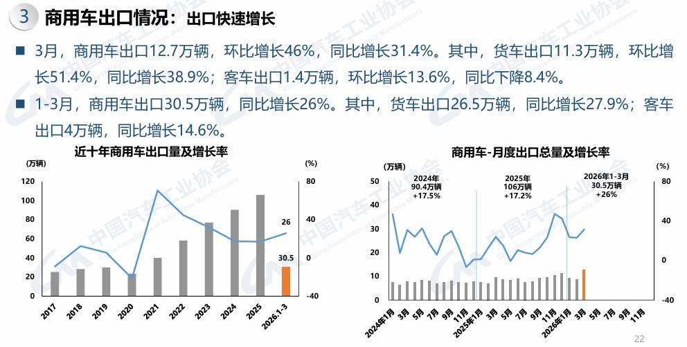 在出口方面,商用车市场同样表现出色。2026年3月,商用车出口12.7万辆,环比增长46%,同比增长31.4%。其中,货车出口成为主力军,达到11.3万辆,同比增长38.9%;客车出口虽然同比下降8.4%,但整体出口形势依然向好。从累计出口来看,2026年1-3月,商用车累计出口30.5万辆,同比增长26%,其中货车和客车出口分别同比增长27.9%和14.6%,显示出中国商用车在国际市场上的竞争力不断提升。
