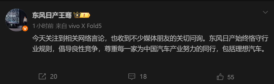 东风日产高管回应李想炮轰:恪守规则倡导良性竞争尊重同行