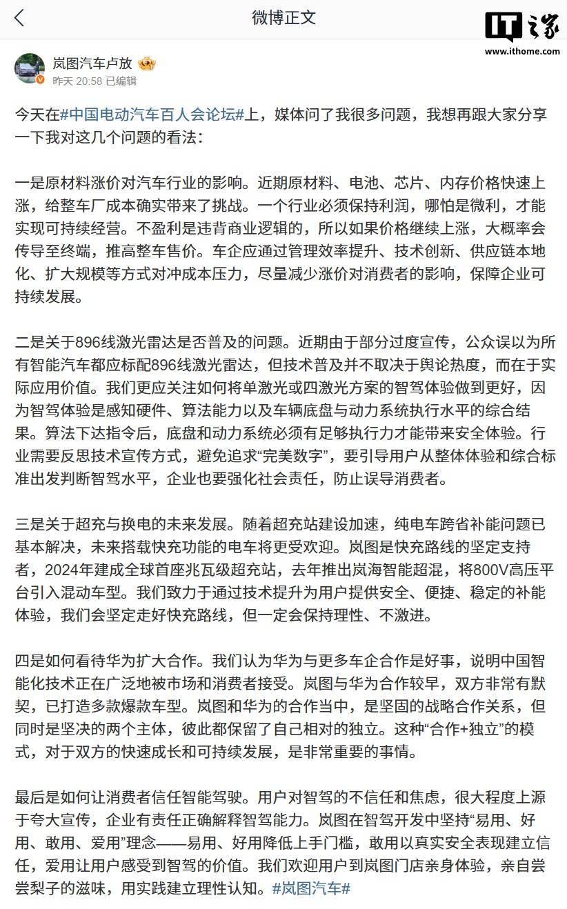 对于华为扩大生态合作的现象,卢放持积极态度。他认为这反映了中国智能汽车技术获得市场认可的良好态势。岚图与华为的早期合作已结出硕果,双方在保持战略协同的同时,始终维持着独立的运营主体地位。这种"合作共生又各自独立"的模式,既促进了技术快速迭代,又确保了企业发展的自主性,为行业合作提供了值得借鉴的范例。