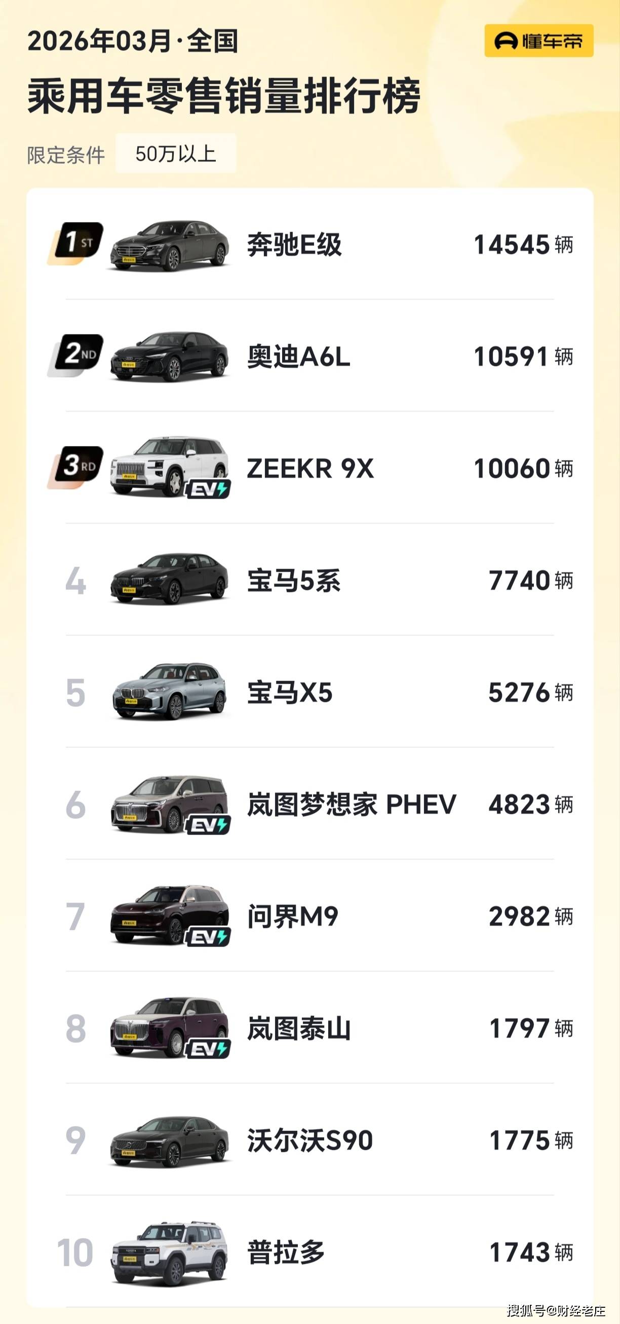 在最新公布的50万级别豪车销量榜单中,奔驰E级凭借出色表现荣登榜首,奥迪A6L与吉利极氪9X分列二、三位。此次榜单前十名的最低销量门槛为1743辆,其中三款车型月销量突破万辆大关,展现出高端市场的强劲活力。