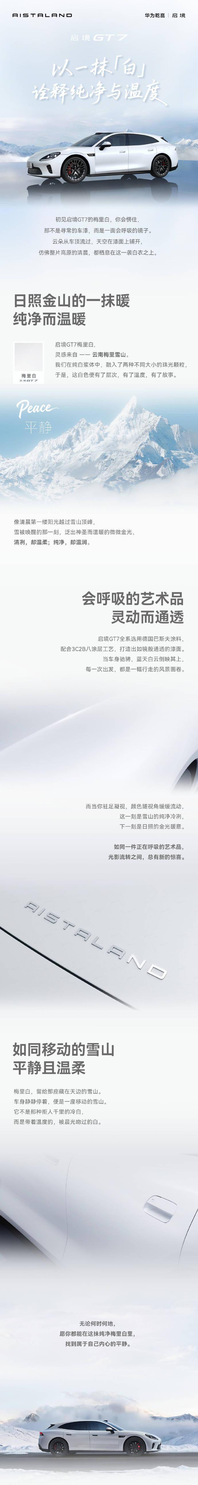 近日,启境汽车正式对外发布了旗下全新车型启境GT7的“梅里白”车色官方图片。该车色采用了德国巴斯夫的高品质涂料,并经过3C2B八涂层工艺精心打造,呈现出如镜面般通透的漆面效果,令人眼前一亮。