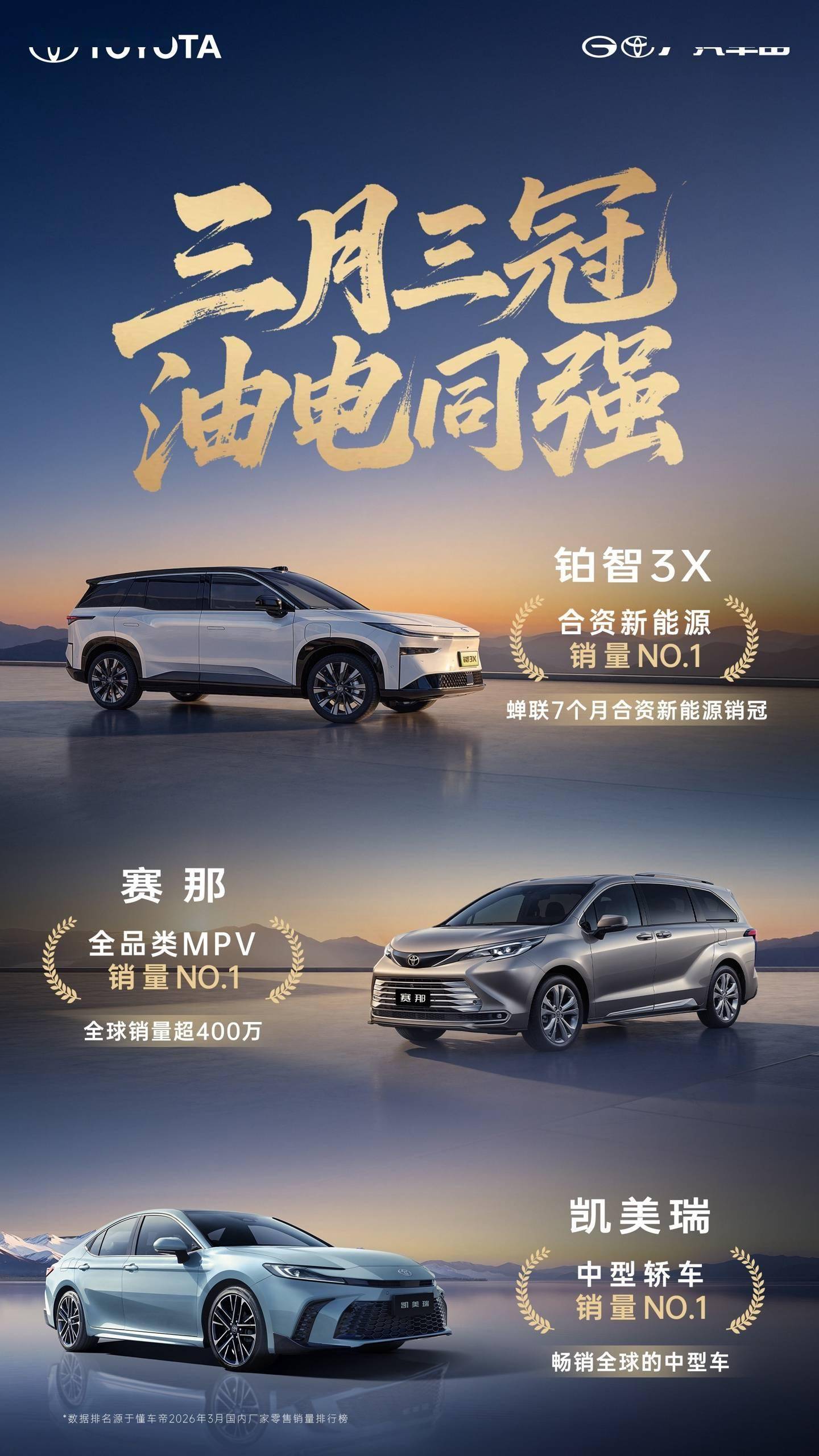 从新能源车型到传统燃油车,从家用轿车到高端MPV,广汽丰田以全面的产品布局和强大的产品实力,实现了油电双线的领跑。此次“三月三冠”的佳绩,不仅体现了市场和消费者对广汽丰田的高度认可,也彰显了品牌在市场深耕和技术创新方面的硬核实力。