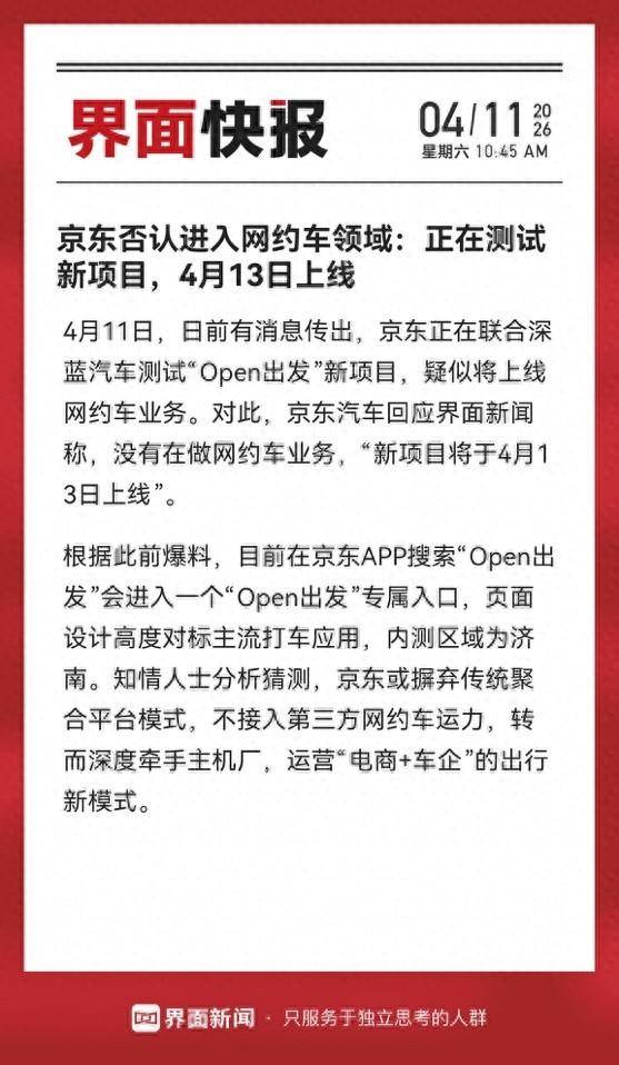 近日,有关京东涉足网约车领域的传闻引发市场关注。此前有消息称,京东正在联合深蓝汽车测试名为“Open出发”的新项目,并计划上线网约车服务。对此,京东汽车方面向媒体明确回应,否认了开展网约车业务的计划,仅表示将于4月13日推出全新项目。
