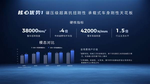 数据层面,星舰车身的扭转刚度达到38000Nm/°,是传统硬派越野标杆车型的近4倍;弯曲刚度为42000N/mm,达到行业主流水平的1.5倍。这一性能提升得益于“前后贯穿式高强度嵌入式大梁”与5纵13横高强钢密构防护框架的协同设计,配合A柱隐藏式抗翻滚架,形成三大核心支撑结构。在极端工况下,车身关键部位覆盖的2000MPa级热成型钢可承受约20吨压力,相当于5头成年亚洲象的重量,碰撞时能快速分散冲击力。A柱采用的2200MPa级热气胀管梁将抗翻滚架嵌入车身环笼结构,顶压能力达12.2吨,为国标要求的2.7倍。