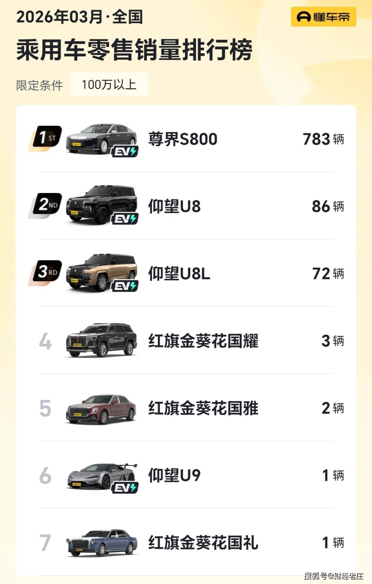 在最新公布的3月份百万级车型销量榜单中,江淮尊界S800以783辆的成绩蝉联冠军,成为国产高端轿车突破价格天花板的标杆案例。同期入围的7款车型中,比亚迪仰望系列贡献3款,红旗品牌贡献3款,形成国产高端阵营三足鼎立格局。