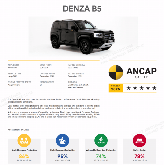 业内专家指出,方程豹豹5的安全设计体现了比亚迪对新能源越野车型的深度理解。其高强度车身结构与智能安全系统的协同作用,既满足了越野场景的极端需求,又兼顾了日常使用的安全性。此次ANCAP五星认证不仅强化了该车型在海外市场的竞争力,更为消费者提供了更可靠的安全保障,印证了“安全即豪华”的产品理念。