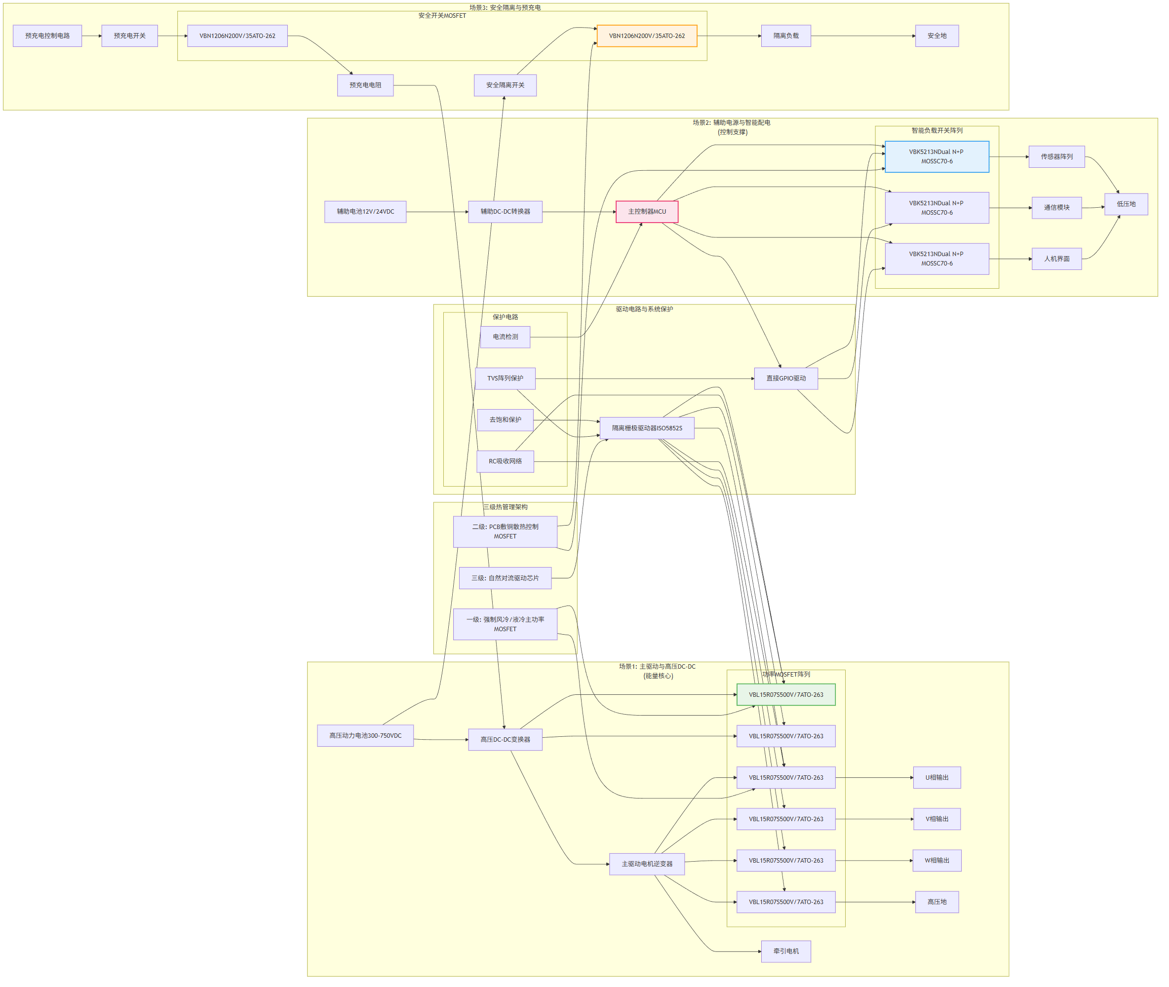 在系统级设计实施方面,驱动电路设计需匹配高压与集成需求。不同型号的功率MOSFET,其驱动电路设计也各有差异。例如,VBL15R07S必须配套隔离栅极驱动器,提供足够的驱动电流并具备去饱和保护功能;VBK5213N可由MCU直接驱动,但为优化开关速度,可在栅极串联小电阻;VBN1206N的驱动电路则需考虑其应用位置,高侧应用需采用自举电路或隔离驱动。热管理设计方面,需分级强化散热。核心发热器件如VBL15R07S,必须安装在独立的散热器上,并采用导热硅脂确保良好接触;VBK5213N可依靠PCB敷铜散热;VBN1206N则根据实际电流决定散热方式。整车电气柜需保证良好通风,优先采用强制风冷。