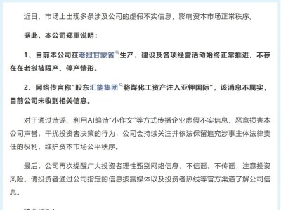 亚钾国际:“股东汇能集团将煤化工资产注入亚钾国际”消息不实 未收到相关信息