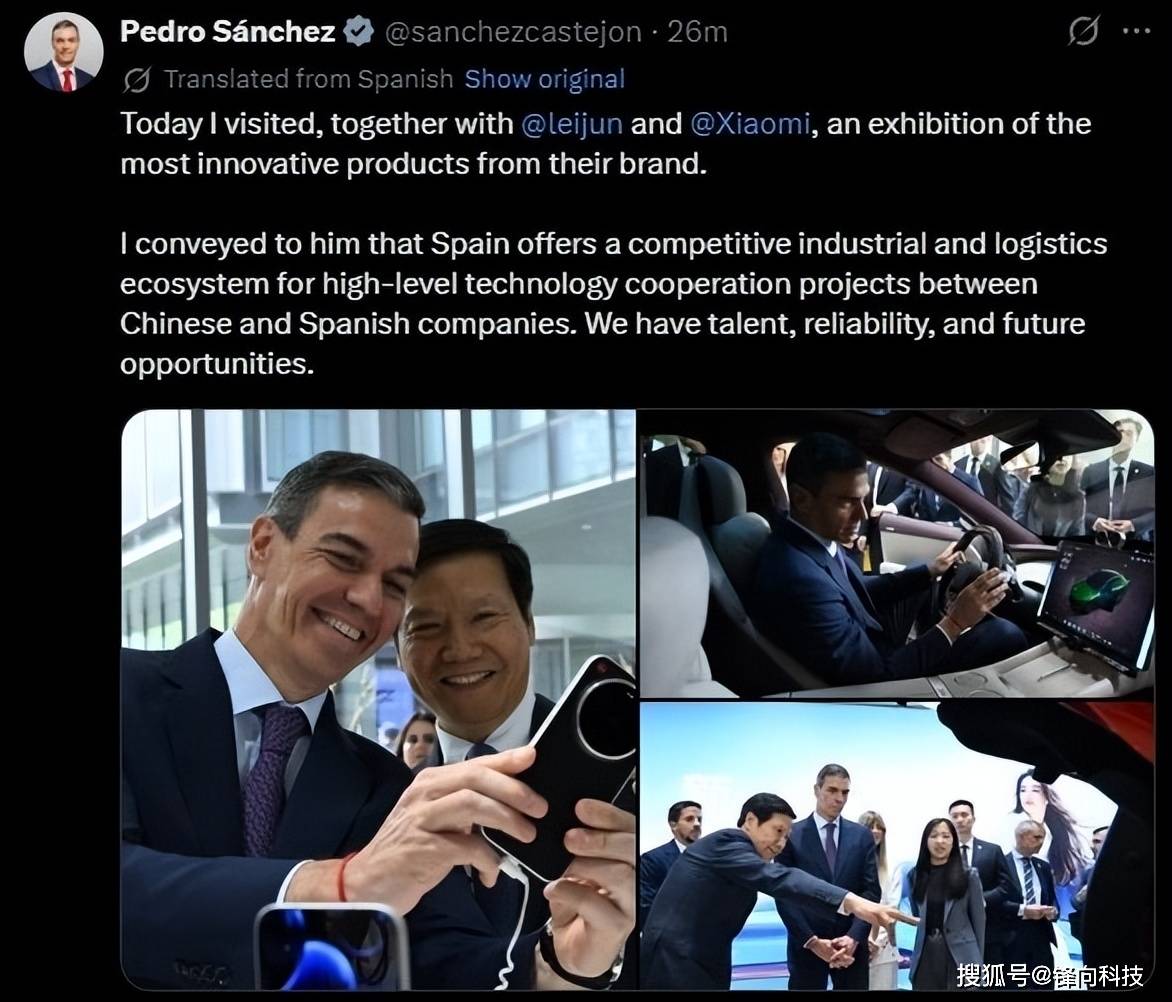 桑切斯随后在社交平台发布图文动态,配发三张体验照片:手持小米17 Ultra拍摄的工作照、查看新一代SU7后备箱空间特写,以及在YU7车内操作智能座舱的场景。他在推文中强调:"西班牙拥有完善的产业生态和物流网络,愿为中西企业技术合作提供全方位支持。"这条动态获得超过10万点赞,众多西班牙网友留言期待小米产品早日进入本国市场。