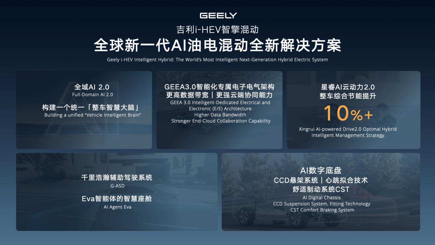 吉利汽车集团近日正式推出全球新一代AI油电混动技术——i-HEV智擎混动,以五大核心技术突破重新定义混动出行标准。这项技术通过全域AI 2.0架构深度整合动力系统与三电技术,实现百公里综合油耗低至2.22L、发动机热效率48.41%的行业领先水平,并成为全球首个获得HEV车型1级能效认证的技术方案。其搭载的星睿AI云动力2.0大模型可实时感知环境数据,智能优化油电分配策略,在城市通勤场景中可降低发动机低效运行时间,实现越堵越省油的突破。