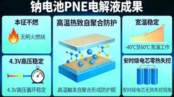 实验数据显示,搭载PNE的钠离子电池顺利通过针刺测试与300℃热箱测试,未出现起火或爆炸现象,且电化学性能未受影响。该电池可在-40℃至60℃宽温域内稳定工作,并支持超4.3V高压运行,兼顾了安全性与能量密度。更关键的是,PNE所用原料均为工业化常规产品,成本可控且易于规模化生产,为商业化落地提供了现实基础。
