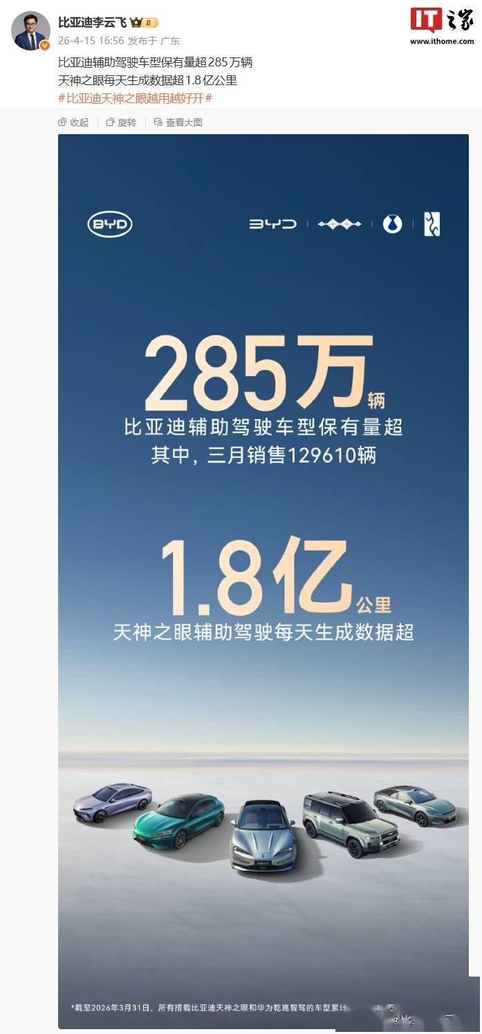 比亚迪集团近日对外披露了其辅助驾驶技术的最新进展。据品牌及公关处总经理李云飞介绍,截至2026年3月31日,搭载比亚迪天神之眼和华为乾崑智驾系统的车型累计销量已突破285万辆,这一数据涵盖了所有已交付的辅助驾驶车型。