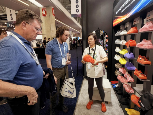 硬件产品的最终指向,是真实场景的应用落地。除了硬件设备,展台现场展出的3D打印鞋成为其生态落地能力的直观载体。这些色彩鲜艳、形态各异的定制鞋吸引了大量观众试穿,并引发了关于尺寸定制及在线订购的密集咨询。