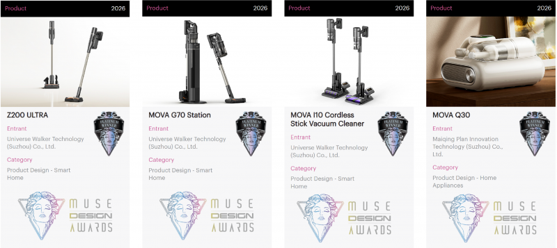2026 年美国缪斯设计奖(MUSE Design Awards)获奖名单近日重磅揭晓,全球高端智能品牌MOVA 旗下的四款吸尘器产品 ——Z200 Ultra、MOVA I0、MOVA G70 station 与 MOVA Q30,凭借卓越的设计创新与技术革新,一举斩获该奖项最高荣誉铂金奖,成为清洁电器行业罕见的 "四冠王",彰显中国智造在全球设计舞台的硬核实力。