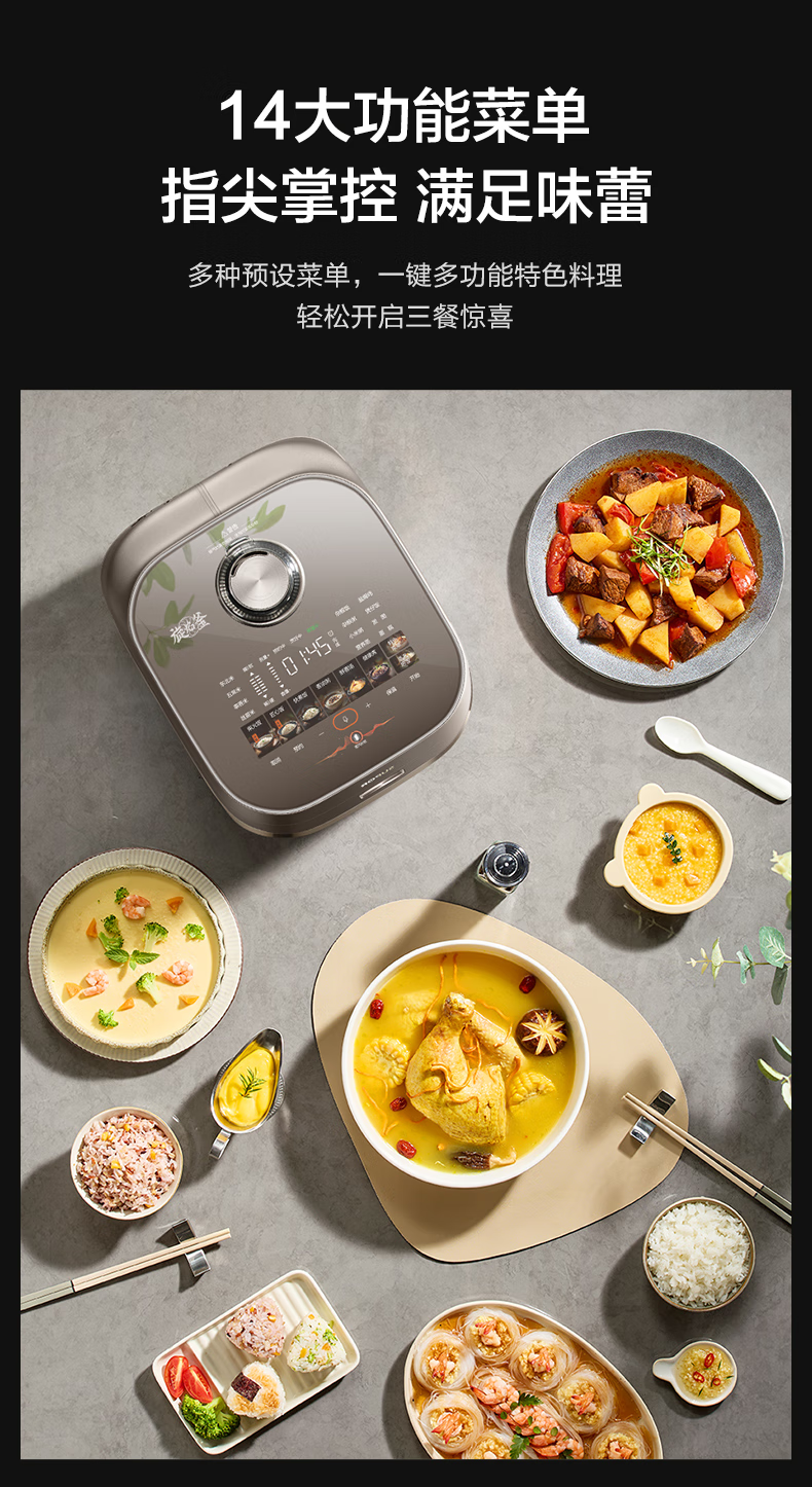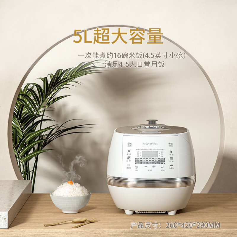 推荐理由:5L大容量,适合4-5人及以上大家庭使用;搭载IH智能加热技术,搭配9层土锅釜内胆,锁香导热效果好,能还原地道柴火饭口感;支持高压烹饪,提升烹饪效率,节省时间;配备多功能菜单,可实现煮饭、煮粥、煲汤、炖菜等多种需求,满足大家庭多样烹饪需求;机身易清洁,材质安全,符合安全烹饪标准。