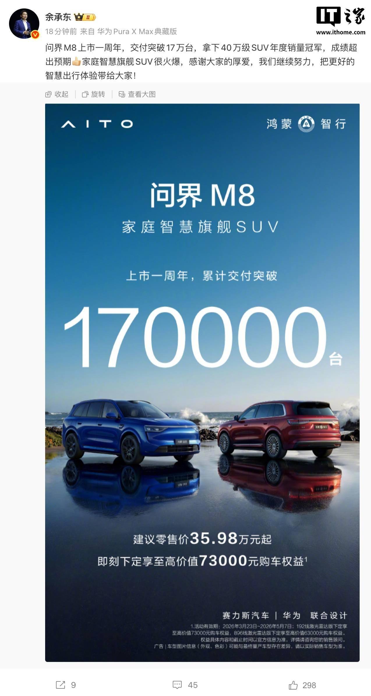 华为常务董事、终端BG董事长余承东近日宣布,鸿蒙智行旗下问界M8迎来上市一周年重要节点。该车型累计交付量突破17万台,成功登顶40万级SUV年度销量冠军宝座,市场表现远超预期目标。