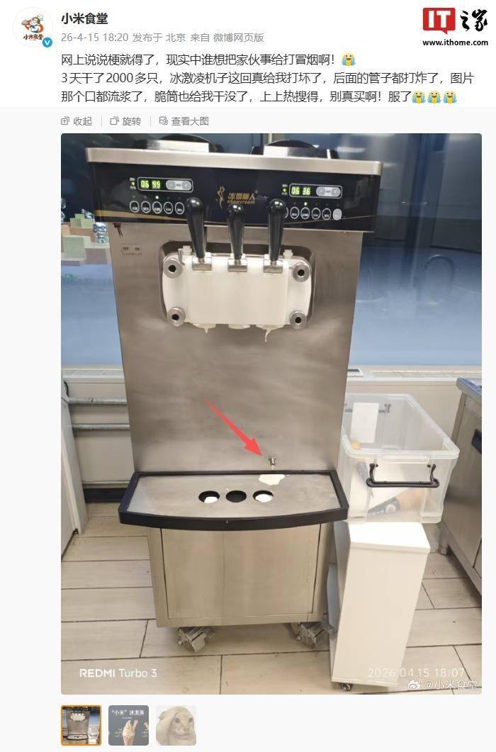 据小米食堂透露,小米冰淇淋在短短三天内售出超过2000只,导致冰淇淋机频繁故障,机器内部管子损坏,内壁出现漏浆现象,制冷系统也出现问题。更让工作人员头疼的是,冰淇淋的脆筒也一度供应不足。小米食堂在社交媒体上无奈表示:“上热搜可以,但别真买啊!真的扛不住了!”
