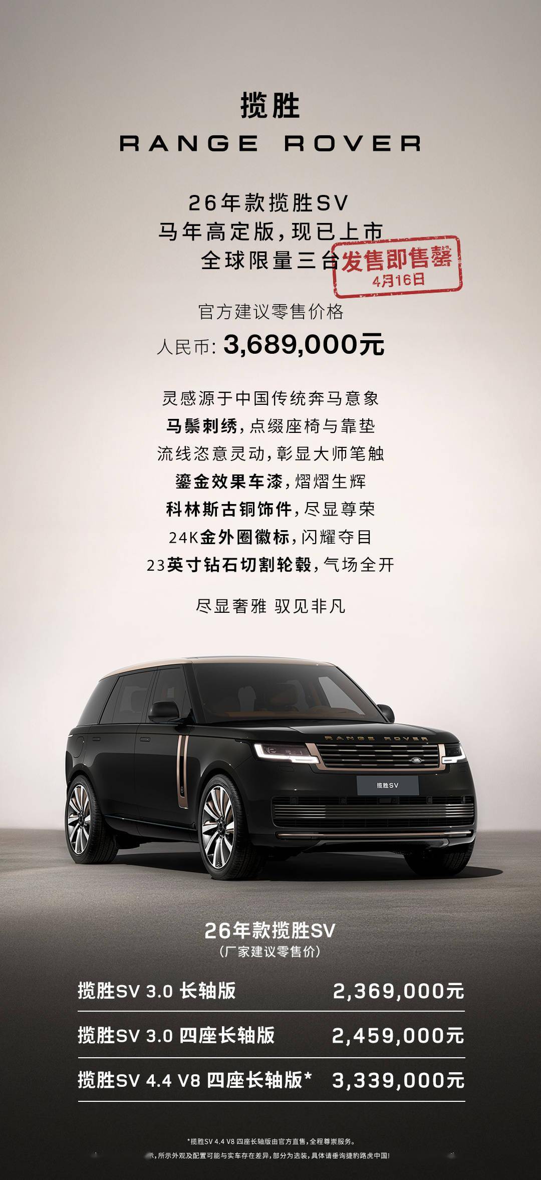 除了对品牌地位的肯定,揽胜之夜还迎来了另一大亮点——揽胜SV马年高定版的全球首发。这款专为马年打造的限量版车型,全球仅限量三台,每一台都承载着揽胜对极致工艺与独特设计的追求。其官方建议零售价格定为368.9万元,尽管价格不菲,但一经发布便迅速吸引了众多收藏家的目光,首发即售罄,再次证明了揽胜品牌的市场号召力与产品实力。