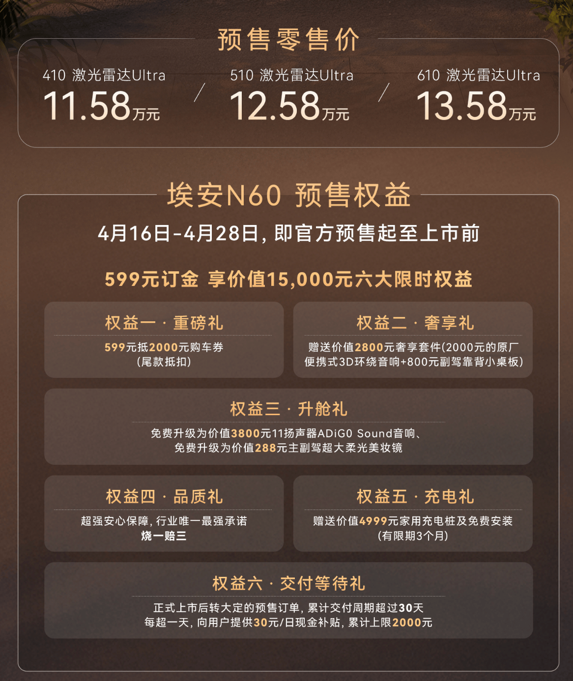 广汽埃安近日正式启动了全新车型N60的预售活动,这款专为年轻消费群体打造的车型,共推出三种配置版本,预售价格区间设定在11.58万元至13.58万元之间。为了吸引更多消费者,官方还特别推出了六项限时预售优惠,包括金融贴息、免费保养以及充电权益等,旨在减轻购车及后续使用的经济负担。