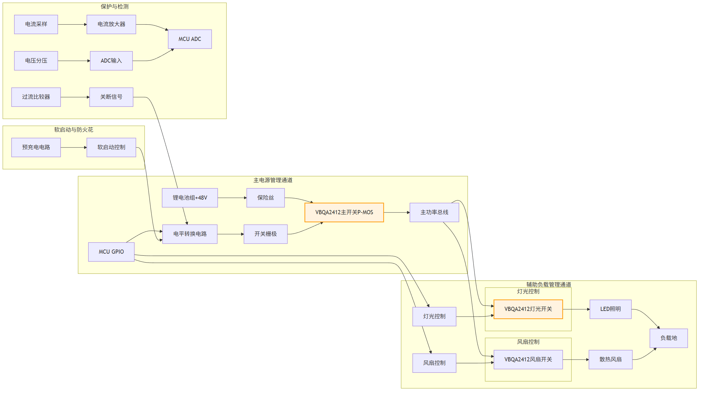 在电池输出及负载管理环节,VBQA2412凭借其-40V耐压、-40A连续电流能力及DFN8紧凑封装,成为高侧开关的理想选择。该P沟道MOSFET支持MCU GPIO通过简单电平转换直接控制高侧通断,无需自举电路,简化了系统设计。其12mΩ(4.5V Vgs)和10mΩ(10V Vgs)的低导通电阻,确保了即使在微控制器电压下也能实现高效导通,减少热损耗。当控制感性负载时,需并联续流二极管以防止电压过冲,同时需通过PCB布局优化抑制Vgs振荡。