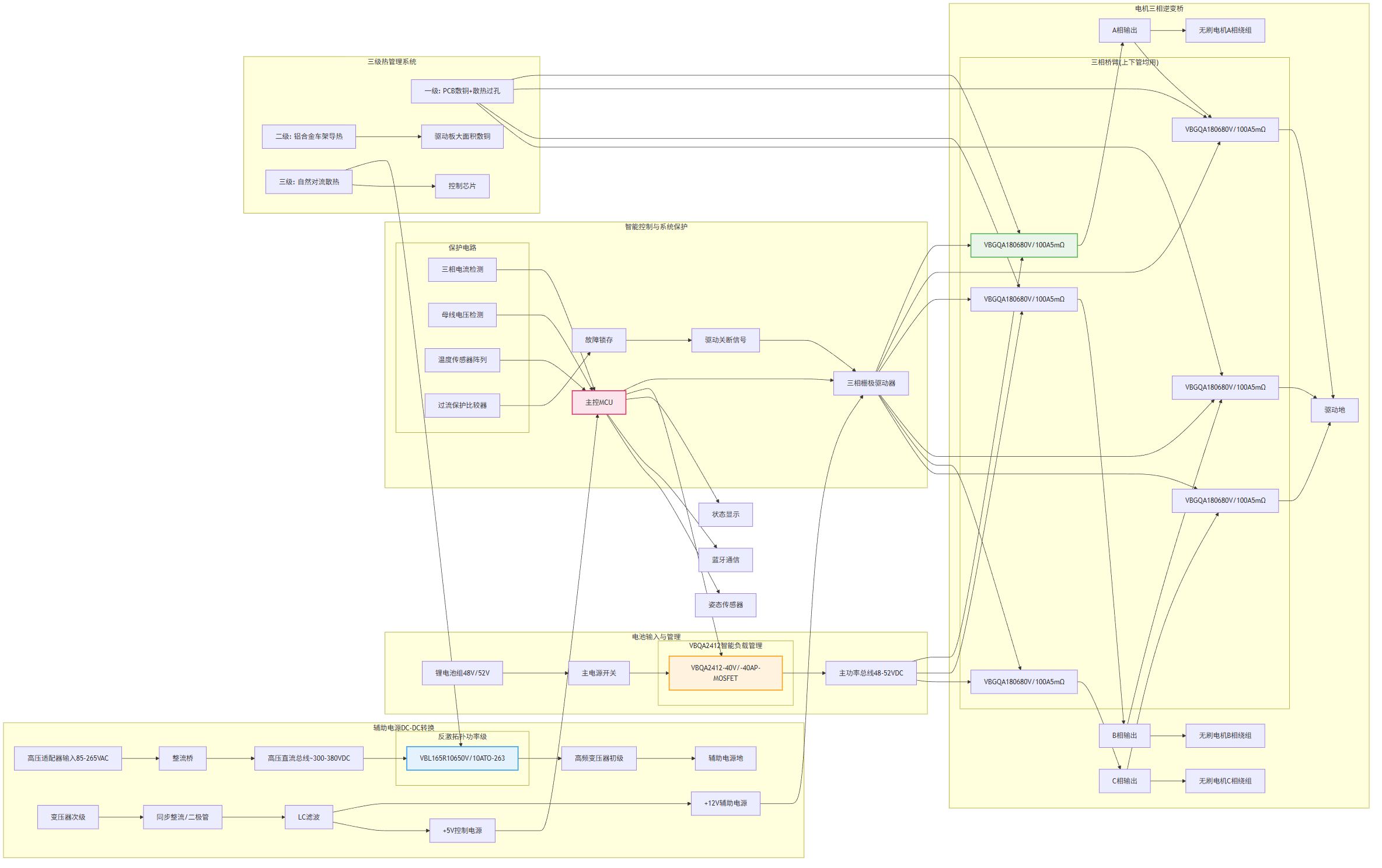 这套功率解决方案的精髓在于“精准匹配、协同优化”。工程师可根据具体产品的电池电压平台(如36V、48V、52V)、电机峰值功率、续航要求及整机尺寸限制,灵活调整器件参数与保护电路设计。例如,在电压降额方面,需确保VBGQA1806在电池充满电且再生制动最恶劣情况下的Vds应力低于64V,VBL165R10在最高输入电压下的应力低于520V;在电流降额方面,需根据器件在预计最高结温下的连续电流与脉冲电流能力进行选型,为电机启动、堵转等瞬态大电流留足余量。