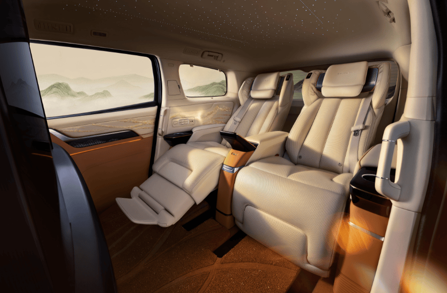作为核心升级点,四座私享座舱的礼宾功能堪称亮点。通过一键操作,二排座椅可与滑移门联动,自动前移至预设的迎宾位置,为乘客提供仪式感十足的上下车体验。座椅采用12层复合结构,表层覆盖北美小公牛皮源Fine Nappa半苯胺真皮,配备22点分区指压按摩系统,并创新性地引入石墨烯远红外理疗技术,将舒适性与健康功能融为一体。