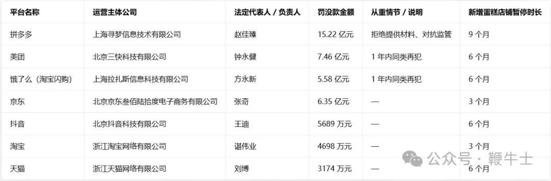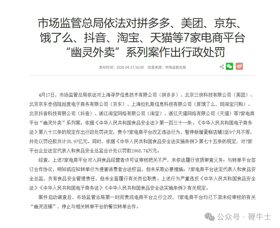 4月17日消息,市场监管总局依法对拼多多、美团、京东、淘宝闪购、抖音、淘宝、天猫等7家电商平台幽灵外卖系列案,依据《中华人民共和国食品安全法》第一百三十一条、《中华人民共和国电子商务法》第八十三条的规定作出行政处罚决定,责令7家电商平台改正违法行为,暂停新增蛋糕店铺3至9个月不等,并处以罚没款共计35.97亿元。