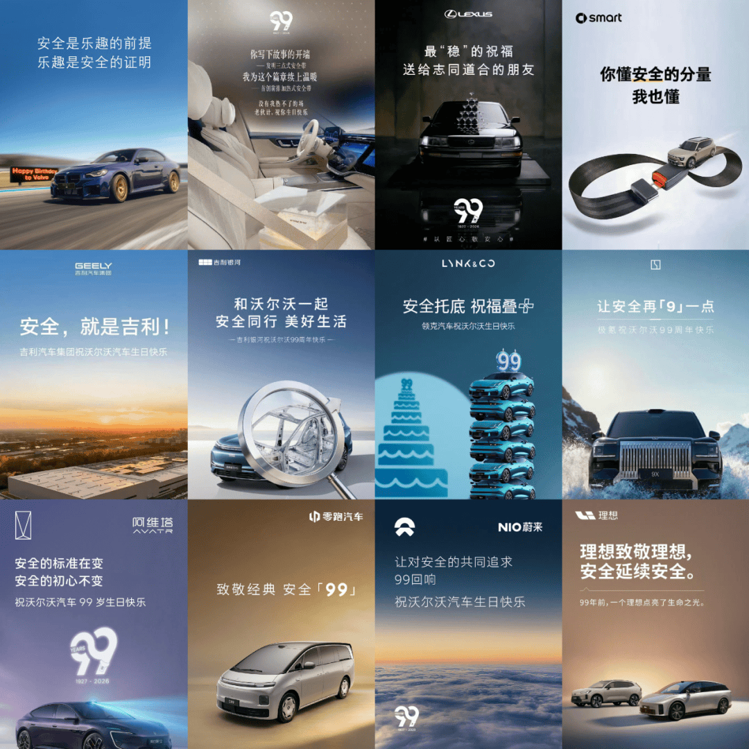 新品牌们则将此次为沃尔沃庆生视为一次低成本高价值的“品牌背书”。阿维塔以“安全的标准在变,安全的初心不变”为核心,既致敬沃尔沃的安全坚守,又锚定自身智能电动时代的安全初心;零跑汽车用 “致敬经典 安全「99」”的巧思,呼应沃尔沃99周年节点,又为零跑D99进行了宣传。蔚来聚焦“共同追求”,借沃尔沃的百年底蕴,提升自身在豪华、安全价值维度的分量;理想以“理想致敬理想,安全延续安全”,将 “生命、理想”与安全传承绑定,把安全从物理保护延伸至家庭责任、人生理想;鸿蒙智行直接抛出 “安全是最大的豪华”,既呼应沃尔沃的核心主张,又强化自身 “智能豪华、安全优先” 的产品标签。