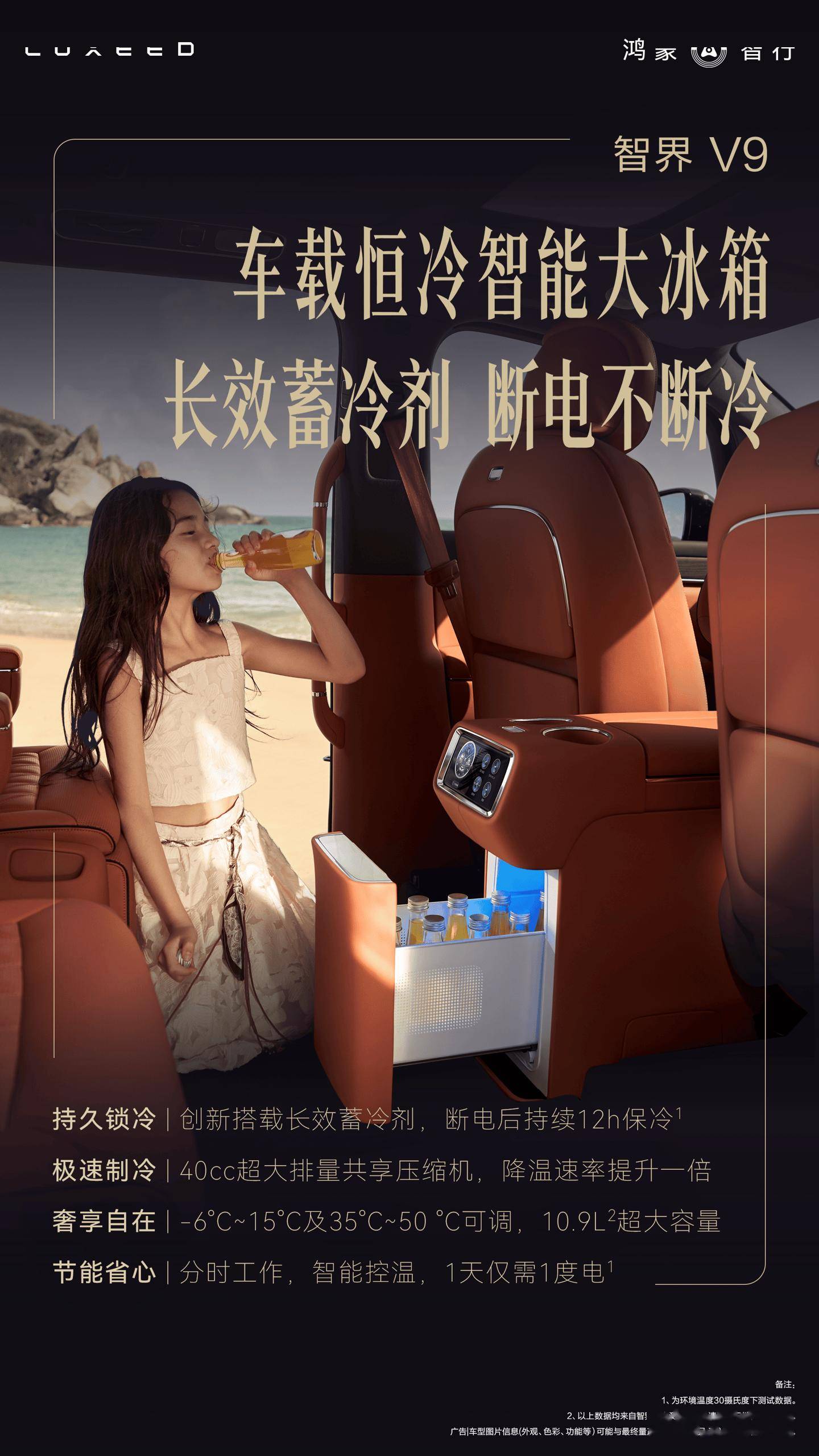 技术创新的背后,是智界V9对高端出行场景的深度洞察。在商务接待场景中,冰箱可确保客户落座即享适宜温度的饮品,细节之处彰显体面;家庭出行时,超大宽温区成为全家的“移动储物间”,无论是孩子的低温辅食、老人的保温热饮,还是露营时的生鲜食材,均能得到妥善保存。例如,近郊露营时,车辆断电12小时保冷技术可让前一晚未吃完的食材或次日早餐的牛奶保持新鲜,彻底消除用户对食物变质的顾虑。