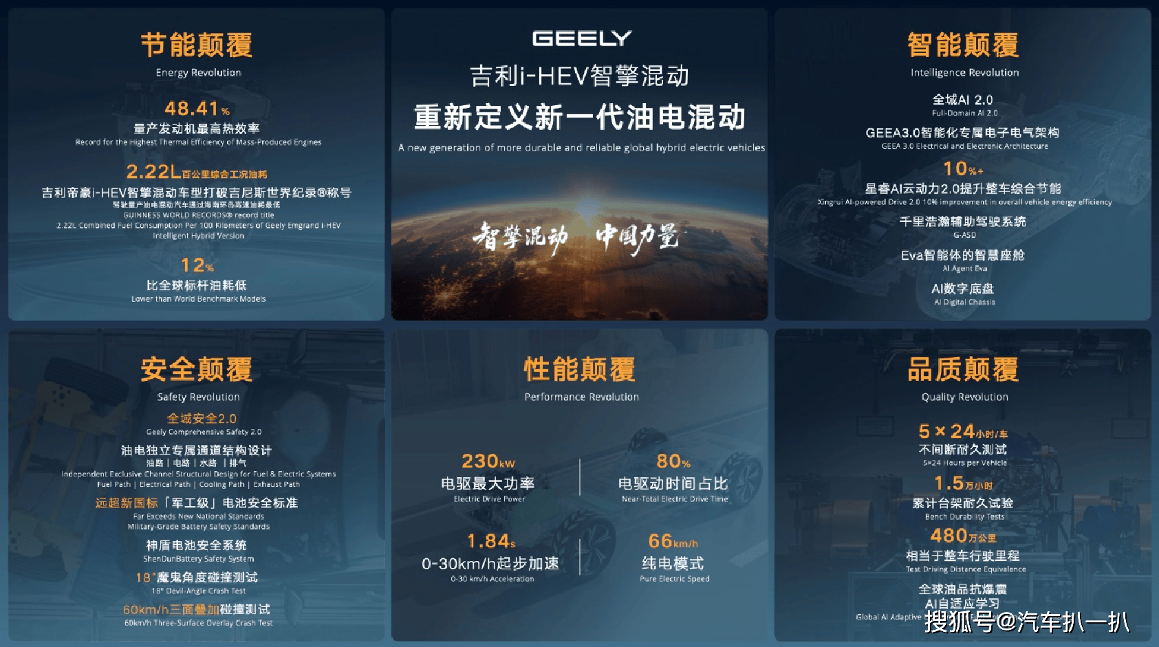吉利汽车集团近日正式推出全球新一代AI油电混动技术方案——i-HEV智擎混动,以“五大颠覆”为核心,重新定义油电混动技术标准。这项技术通过全域AI 2.0技术赋能,深度融合全球顶尖动力系统与三电技术,实现了百公里综合油耗低至2.22L、发动机热效率达48.41%、HEV车型1级能效等多项行业突破,标志着中国汽车动力技术迈入全球领先行列。