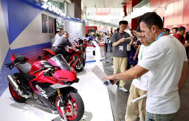 展位上,乌拉圭采购商伊格纳西奥正在与工作人员深入洽谈。他表示,此前已采购过张雪机车产品,此次希望争取南美区域总代理权,将产品批量引入当地市场。巴西客商索萨则直接表达了引进意向,而多位欧洲采购商则围绕产品认证、交付周期等细节展开咨询。据现场工作人员介绍,开展首日就接待了数十组海外客商,其中不乏要求独家代理的优质合作伙伴。