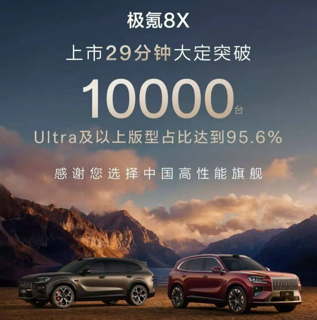 4月17日上市的极氪8X进一步拓展高端性能市场边界。这款定位高性能大五座旗舰SUV的车型,限时售价32.98万-39.98万元,曜影版达47.38万元。上市29分钟即斩获万辆订单,其中Ultra及以上车型占比95.6%,平均价格超40万元。该车直接对标宝马X5M、奔驰AMG GLE等百万级豪车,却以"8系"之名实现"9系"配置——全栈900V高压架构、三电机兆瓦级电驱、4S级AI数字底盘等10余项行业首创技术,重新定义新能源豪华性能标准。