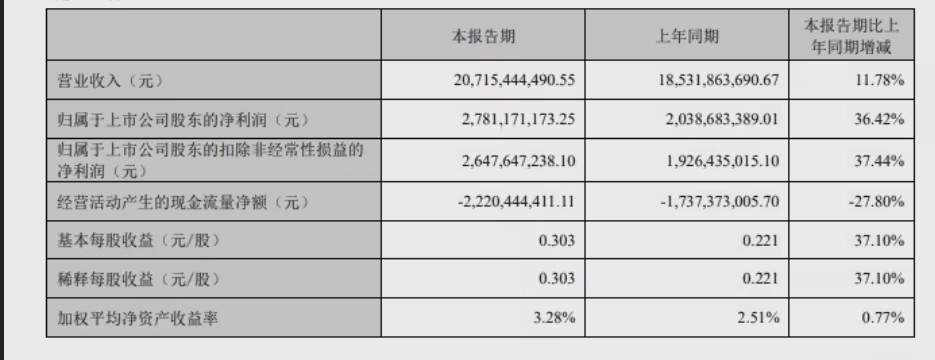 2026年第一季度经营数据显示,公司当期实现营业总收入207.15亿元,同比增长11.78%;归母净利润27.82亿元,增幅达36.42%;扣除非经常性损益后的净利润为26.47亿元,同比增长37.44%。基本每股收益与稀释每股收益均为0.303元,较上年同期提升37.10%,加权平均净资产收益率同比增长0.77个百分点至3.28%。值得注意的是,受供应链结算周期影响,一季度经营性现金流净额为-22.20亿元,同比下降27.80%。