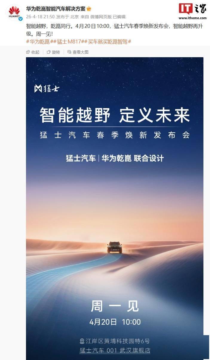 猛士汽车即将迎来一场重要发布。华为乾崑智能汽车解决方案官方日前宣布,猛士汽车春季焕新发布会将于4月20日上午10点正式开启,活动以“智能越野再升级”为主题,引发行业广泛关注。