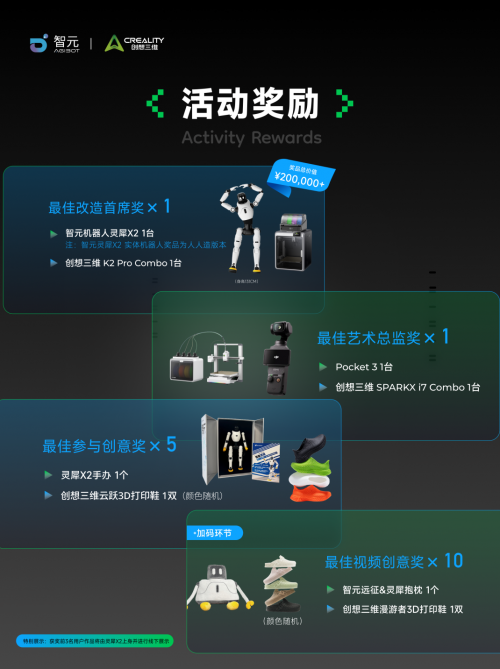 最高奖得主将获得一台灵犀X2(人人造版本)与一台创想三维K2 Pro Combo,前3名获奖作品还有机会由真实的灵犀X2机器人“上身”线下展示。