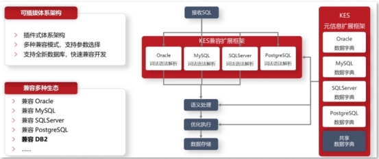 金仓数据库采用可插拔式体系架构,在内核层面实现了多语法解析引擎的隔离与共享。通过词法语法插件和数据字典插件,针对Oracle、MySQL、SQL Server、PostgreSQL等不同数据库,使用各自的解析插件,避免语法冲突,同时共享底层数据存储与优化执行引擎。