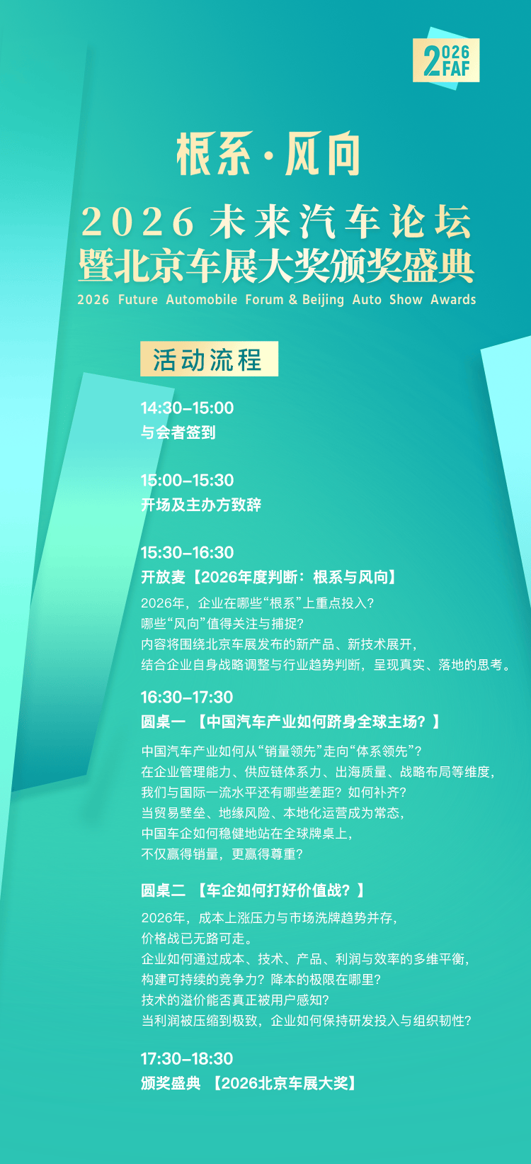 论坛以“根系·风向”为主题,聚焦中国汽车产业在变革深水区中的核心议题。面对产业发展的确定性与不确定性,论坛将深入探讨如何助行业锚定根基、辨析方向。其中,“根系”象征着用户价值、技术积累、组织能力等深层次的确定性因素,是产业稳健发展的基石;“风向”则代表着需要捕捉的不确定性和变革方向,指引产业在变革中前行。论坛认为,只有根系深厚,才能在风向变化中保持稳定,实现可持续发展。