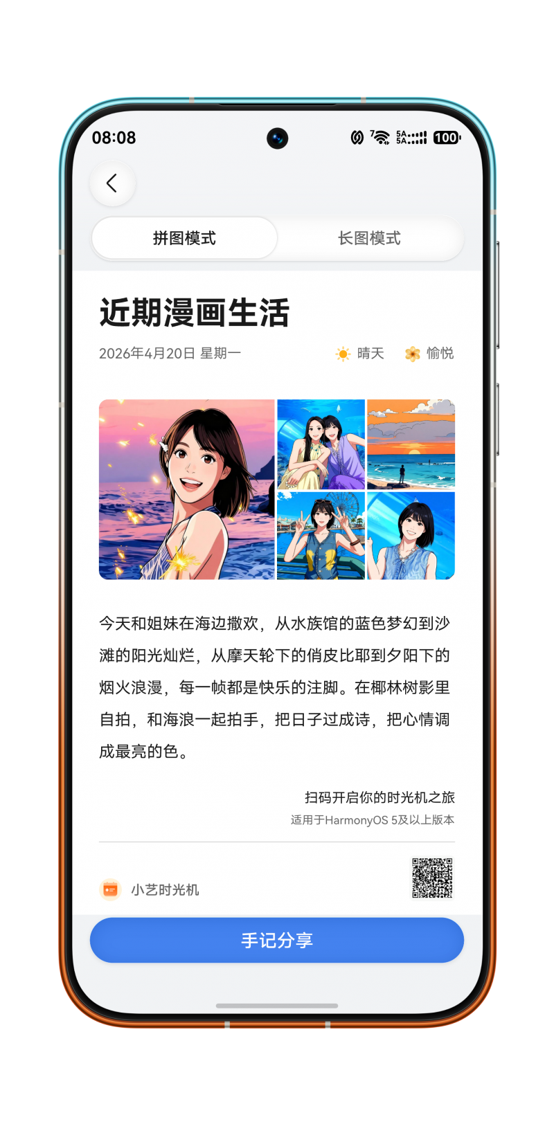 记录与表达,正成为年轻一代的生活方式。小艺用AI技术持续帮助更多年轻用户进行影像创作,用有趣好玩的AI功能降低创作门槛。比如“小艺时光机”在日常生活、亲子成长、节日欢聚等核心场景中的升级,能为用户的美好记忆增添童话色彩。授权后,小艺时光机智能感知梳理用户的生活照片、地点、天气等信息,后台无感生成漫画风格的趣味日记;无论是亲子成长的温馨场面,还是节日欢聚的美好瞬间,小艺时光机都能生成独具风格主题的手记,并配以灵动文案,帮助用户记录下精彩瞬间与美好时光,让分享充满故事性与个性魅力。