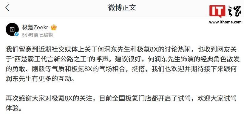 社交媒体上关于“西楚霸王代言新公路之王”的创意提议引发广泛讨论后,极氪汽车官方作出积极回应。品牌方表示已注意到网友将何润东的硬汉气质与极氪8X车型相联结的创意,认为其饰演的经典角色所展现的勇毅精神与新车气场高度契合,并公开表达期待与这位实力派演员展开深度合作。目前全国极氪门店已全面开启试驾服务,品牌方借此契机邀请公众亲身体验新车性能。