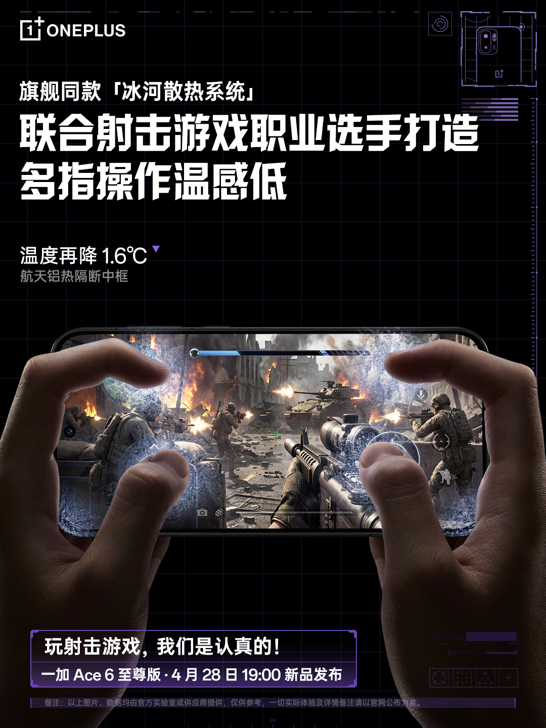 散热方面,一加 Ace 6 至尊版配备了旗舰同款「冰河散热系统」:6K超大「冰河VC」面积,配合由10μm 厚手撕钢材料打造的 3D 超薄双通道毛细结构、以及2127W/mK 超临界导热石墨,散热速率成倍提升。针对射击类玩家长时间操控时高频接触区域易发热的痛点,一加 Ace 6 至尊版还联合射击游戏职业选手,以专为多指操作优化的散热路径,结合「航天铝热隔断中框」快速散热特点,有效降低持续游戏时的机身温度,保障玩家舒适的握持体验。