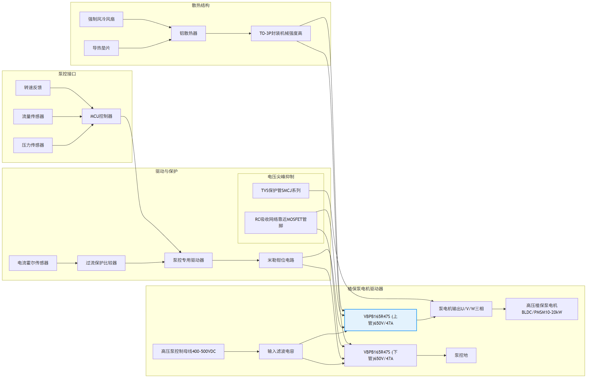 系统级设计需重点关注驱动电路、热管理及电磁兼容性。主驱动器件建议采用隔离驱动芯片与负压关断电路,驱动回路寄生电感需控制在5nH以内;高压泵控制驱动回路应配备米勒钳位功能,防止门极电压振荡;辅助电路则可通过MCU GPIO直接驱动,栅极电阻取值22-100Ω以平衡开关速度与EMI噪声。热管理方面,主功率器件需采用液冷板或大型铝散热器,接触面压力均匀性需通过导热硅脂与机械固定装置保障;辅助器件则依赖PCB敷铜散热,敷铜面积不低于50mm²。